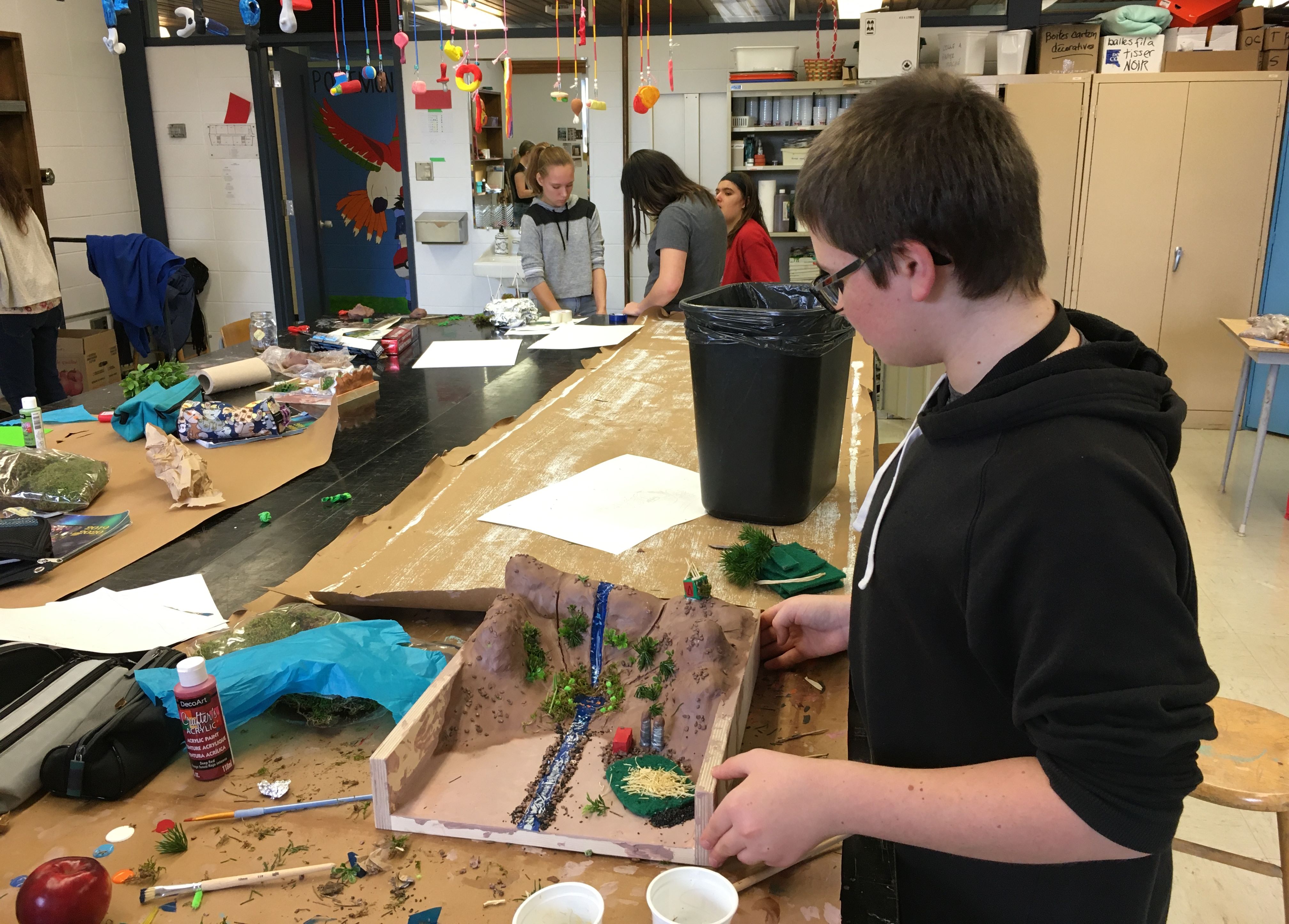13 élèves en cheminement particulier (agés entre 13 et 16) ans de l'école polyvalente de Trois-Pistoles participent à un atelier de création 3D d'une maquette de bassin versant.