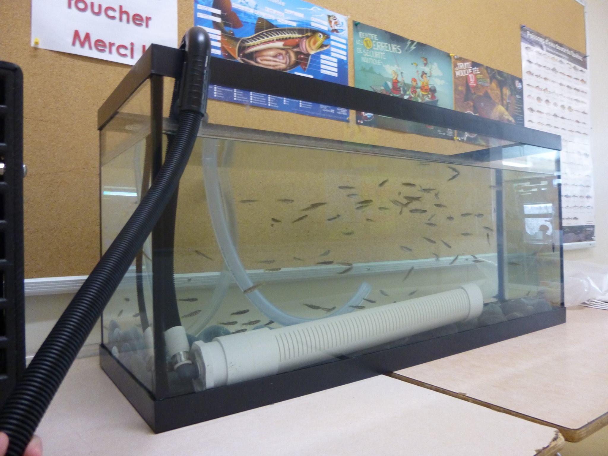 Nous installons un aquarium avec son système de filtration et de refroidissement en classe et nous apportons les oeufs de salmonidés.