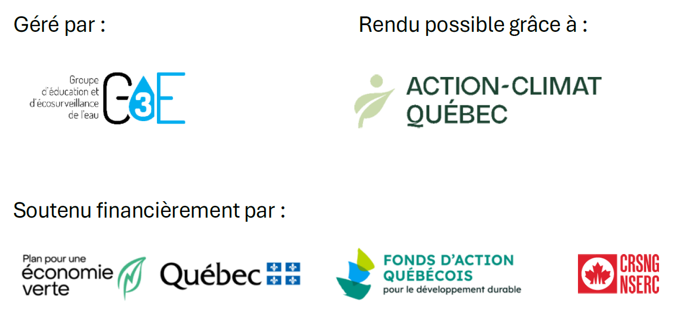Le projet Des rivières surveillées, s’adapter pour l’avenir – Volet J’adopte un cours d’eau est géré par le Groupe d’éducation et d’écosurveillance de l’eau (G3E) avec la collaboration de l'OBVNEBSL et bénéficie d’un soutien financier du gouvernement du Québec dans le cadre du programme Action-Climat Québec, coordonné par le Fonds d’action québécois pour le développement durable et qui découle du Plan pour une économie verte 2030. Nous remercions aussi le Conseil de recherches en sciences naturelles et en génie du Canada (CRSNG) de son soutien.