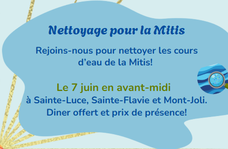 Cette activité, en collaboration avec Éco-Mitis, le Parc régional de la rivière Mitis et les municipalités est ouvert à tous et à toutes.