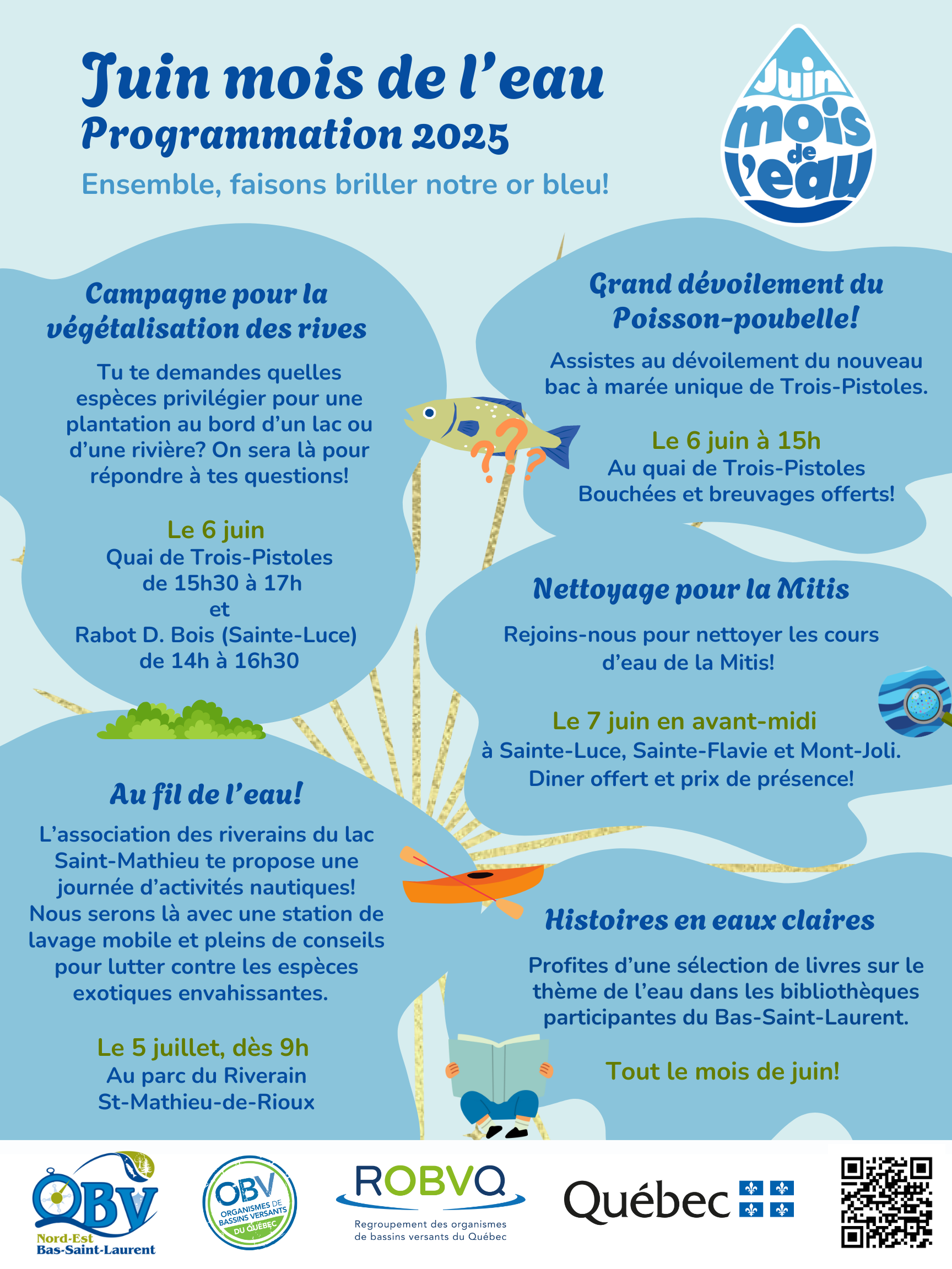 Durant le mois de juin, l'OBVNEBSL et de nombreux partenaires vous proposent des activités en lien avec l'eau, afin de promouvoir sa grande importance et de créer des opportunités d'être mieux informé sur les risques qui l'entourent.