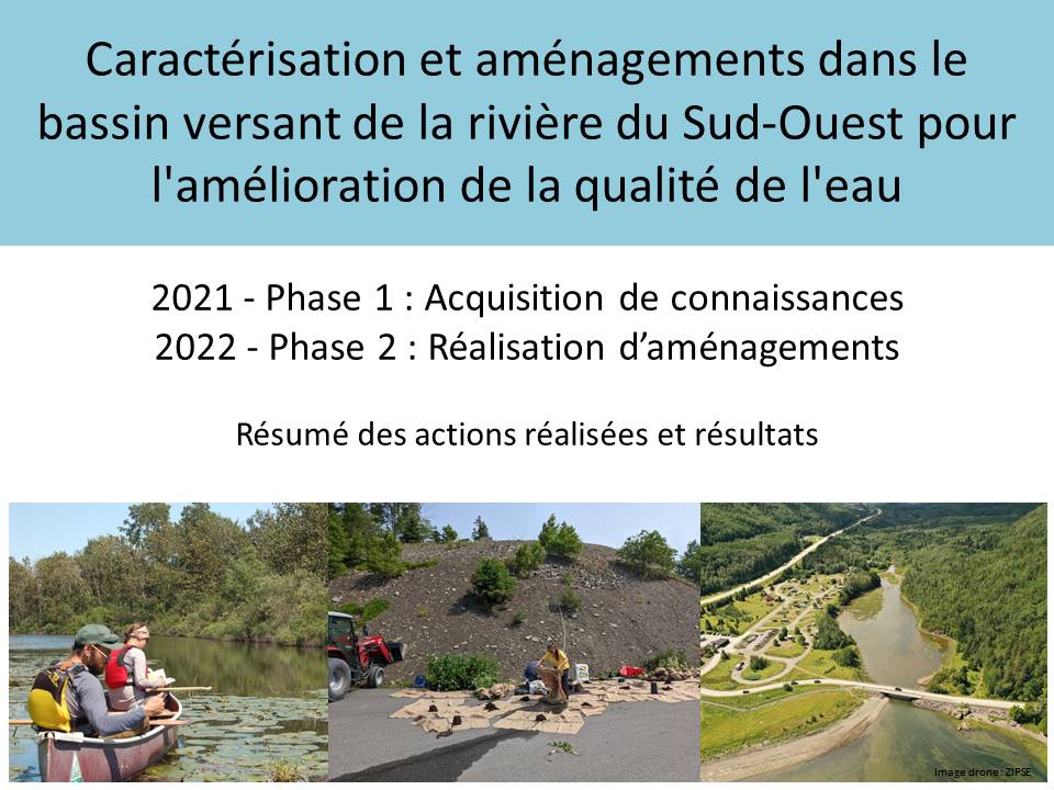 Une première phase d’acquisition de connaissances à l’échelle du bassin versant de la rivière du Sud-Ouest a été réalisée en 2021. Celle-ci visait à déterminer l’état de santé général du bassin versant, à connaitre la qualité de l’eau et des bandes riveraines des principaux cours d’eau, de même que les secteurs les plus problématiques. Des recommandations ont été émises afin d’améliorer la qualité de l’eau de la rivière du Sud-Ouest et de ses principaux lacs.